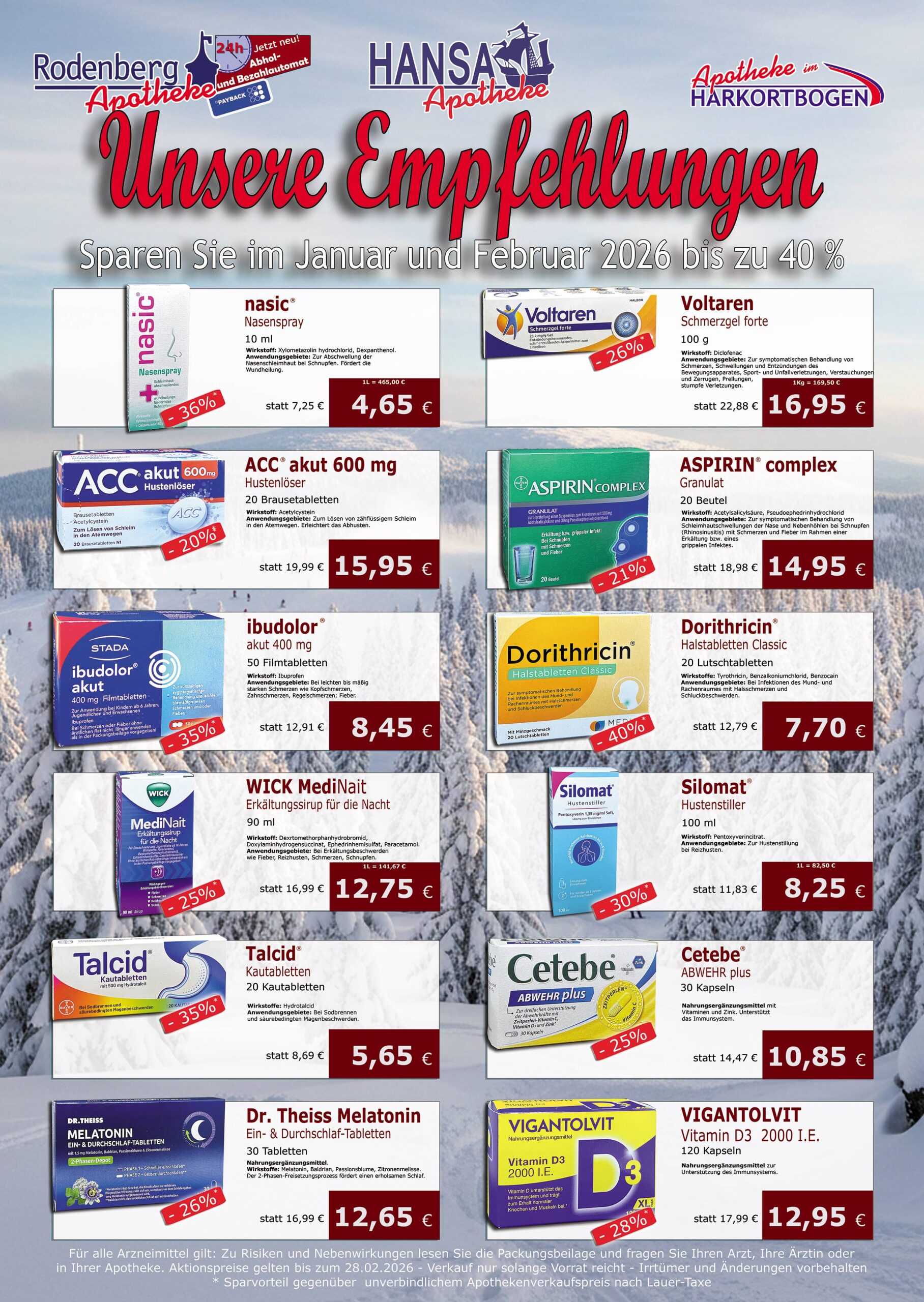 Mit unseren Angeboten sparen Sie im Januar und Februar bis zu 40% ! (Sparvorteil gegenüber unverbindlichem Apothekenverkaufspreis nach Lauer-Taxe)